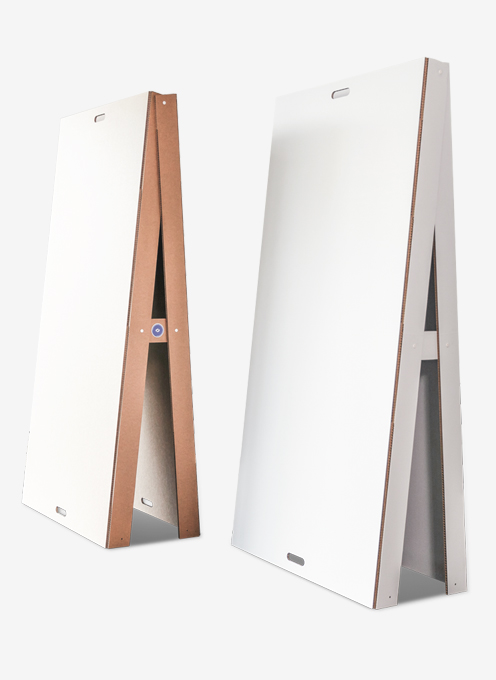 Light, thin and sturdy at the same time: this 10 mm cardboard honeycomb panel shows that this does not have to be mutually exclusive. Folded in the right places, it withstands high loads. We call the versatile stand SYSBOARD / FOLD. There are four possible uses: as a standalone, as a table chart, hanging on the wall or leaning against it. The moderation wall is set up and rebuilt in no time. In addition, it folds up to a small pack size.